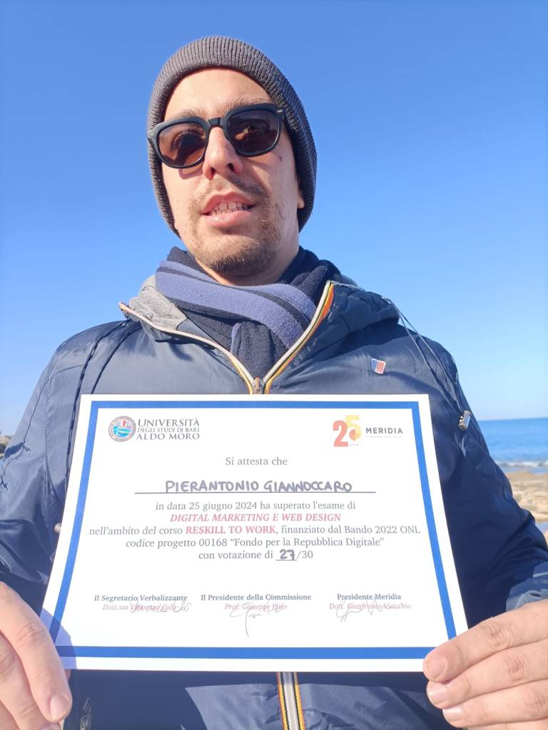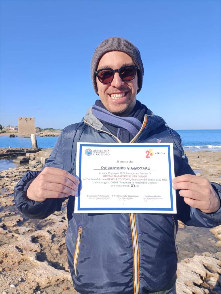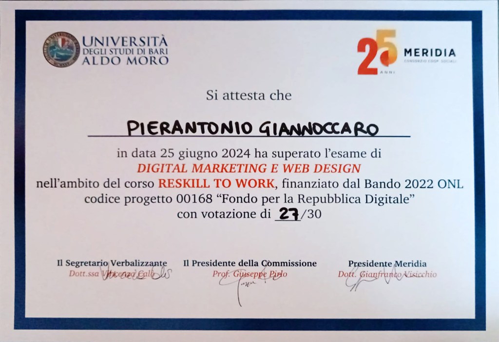 Il 25 giugno poi è stata la grande data in cui sono andato a Bari a ricevere la certificazione che attesta che adesso sono un digital marketing e web design specialist. Ho avuto anche un bel voto: 27 su 30! Chissà se un giorno potrò lavorare in questo campo, mi piacerebbe moltissimo. Intanto sono felice che quest’anno stia finendo con una certificazione così importante e così sudata, perchè più cose si imparano e più se ne vogliono imparare.