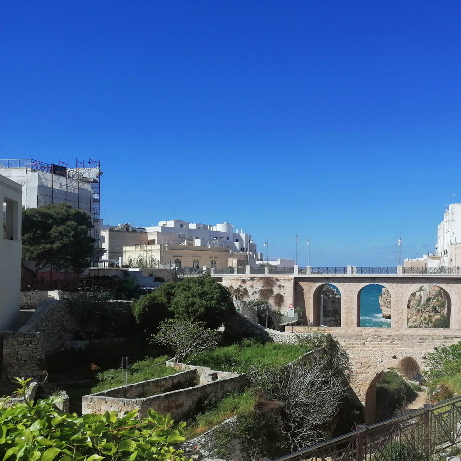 In questa foto del ponte che si affaccia su Lama Monachile si nota l’antica via romana, sostituita dal ponte stesso. Si può vedere il mare in lontananza e la spiaggia vicina al centro del paese. Per le sue caratteristiche è accessibile sia di giorno che di sera.