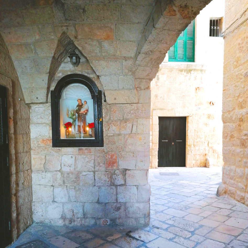 Il centro storico è famoso anche per le balconate a picco sul mare. Nella nicchia in foto è raffigurato Sant’Antonio. La statua è posta nella strada che collega una balconata con l’altra, nei pressi della ex chiesetta dedicata a Santo Stefano.